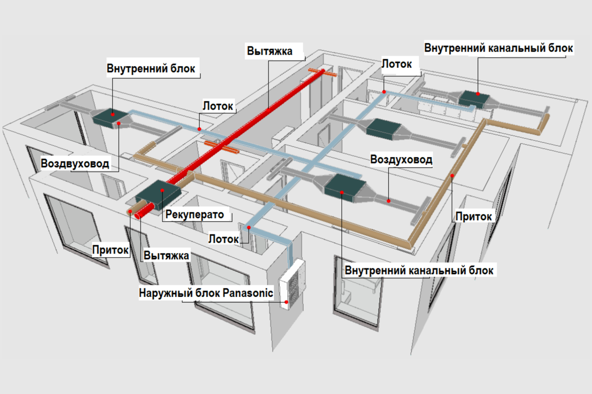 VRF системы Panasonic представляет собой климатическую систему, которую можно применять как для обогрева, так и для охлаждения воздуха в помещении, устанавливается в запотолочном пространстве и состоит из наружного и внутреннего блоков. Наружный блок монтируется на стене здания. Внутренний блок скрыт от глаз и воздух от него подаётся через систему воздуховодов в кондиционируемые помещения из раздаточных решёток в стенах или диффузоров, расположенных на потолке помещения. Все настройки вводятся через пульт управления. Опционально возможна установка проводного стационарного пульта. Вы можете самостоятельно выбрать скорость и температуру воздушного потока, а можете включить автоматический режим, и система подберет наиболее подходящий алгоритм работы, при котором заданная температура будет достигнута с минимальными затратами электроэнергии. Это поможет не только не отвлекаться лишний раз на поднастройку кондиционера, но и сэкономить на электричестве. А установка рекуперации воздуха, предназначенная для отвода из помещения отработанного воздуха и одновременного наполнения свежим с улицы, но при этом теплообменный эффект останется неизменным . У подогретого выходящего воздушного потока отбирается тепло и передается поступающему (либо наоборот, если в помещении летом включен кондиционер).